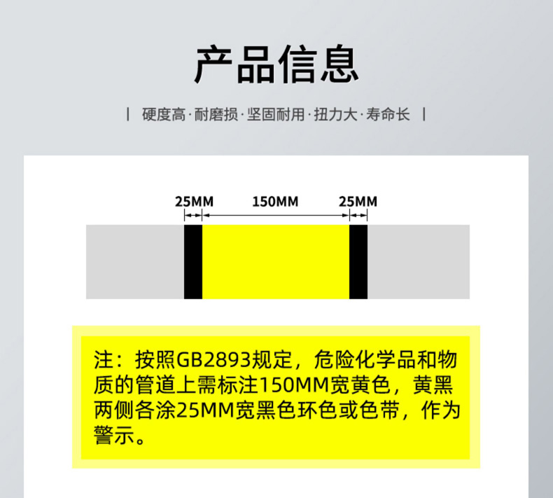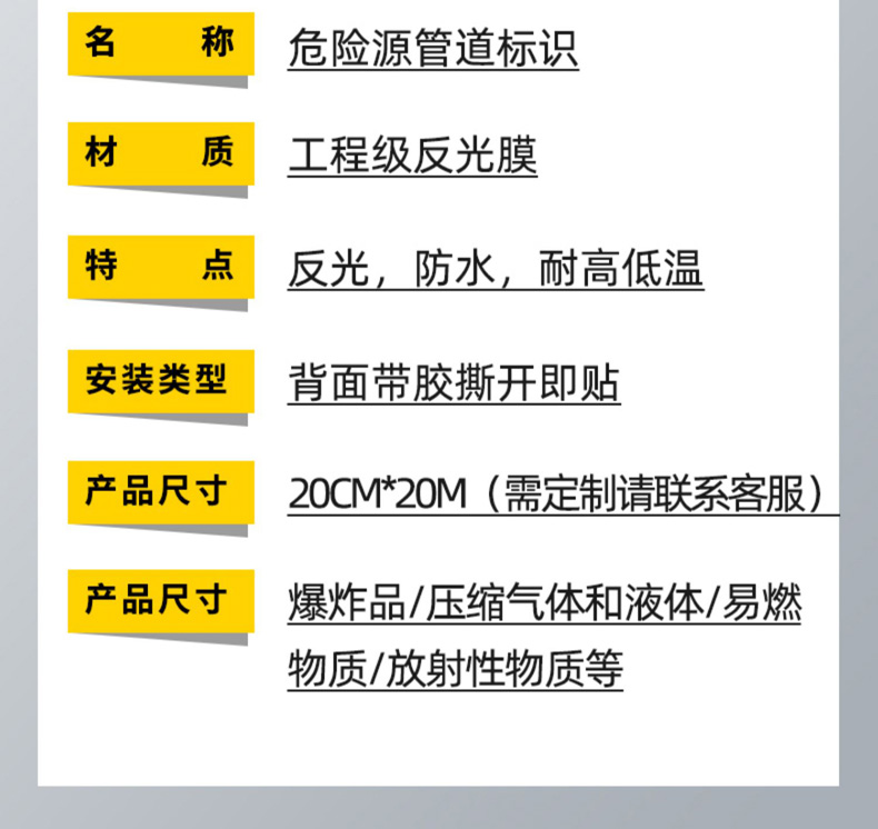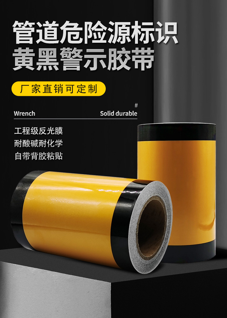我們的管道危險源標(biāo)識產(chǎn)品,為您的安全保駕護(hù)航。20cm 黑黃警示膠帶,顏色醒目,黑黃相間,能在遠(yuǎn)距離吸引注意,警示人們管道危險區(qū)域。反光?;窐?biāo)識自帶背膠,粘貼便捷,粘性強(qiáng)、不易脫落。其反光特性,使人們在光線不佳的情況下也能清晰識別?;穮^(qū)域。無論是工廠管道、倉庫存儲,還是實(shí)驗(yàn)室等場所,這些標(biāo)識都能發(fā)揮重要作用,有效預(yù)防危險事故,為您的生命財(cái)產(chǎn)安全豎起堅(jiān)固的防線。